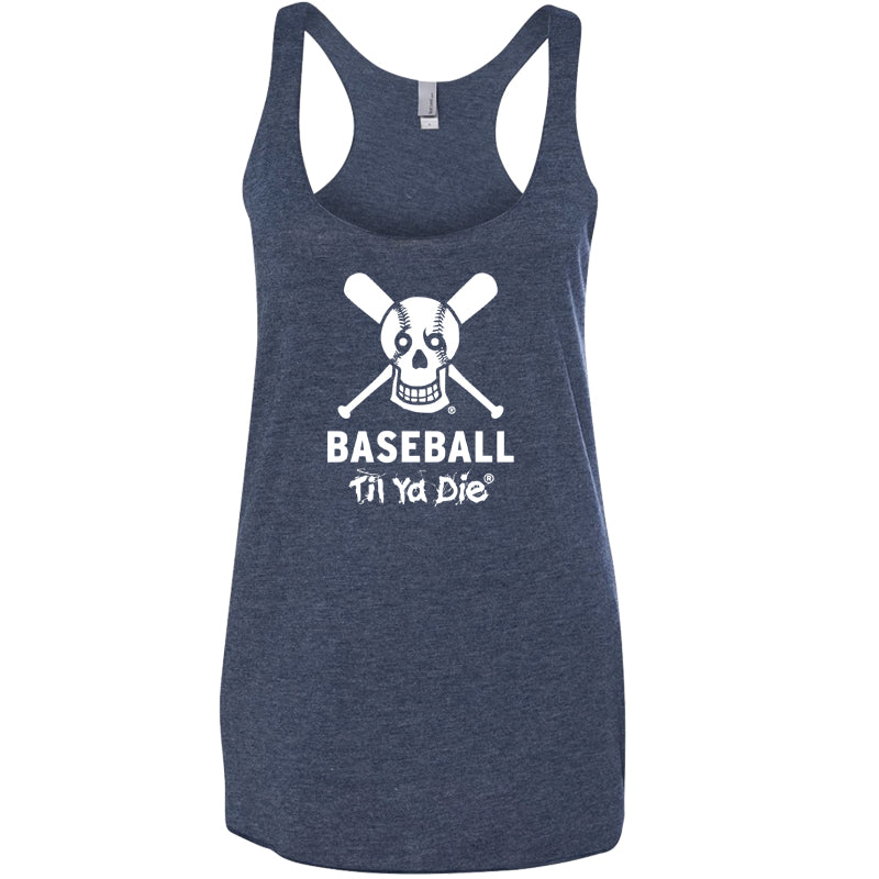 Live, laugh, and love baseball for eternity with our Baseball Til Ya Die women's racerback! Stylized stitching of classic baseballs and bats forming crossbones create a lively design on our iconic skull.